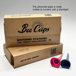 Bee Cups watering stations collect a teaspoon of water for thirsty bees and butterflies. Each one is handmade from porcelain and has an ultraviolet ceramic glaze that pollinators love. Bees, birds and butterflies see the ultraviolet colors all the time, but humans need a blacklight to make them visible. The shape of the porcelain watering stations encourage evaporation and prevent mosquitoes. In most climates the water evaporates by the end of the day.