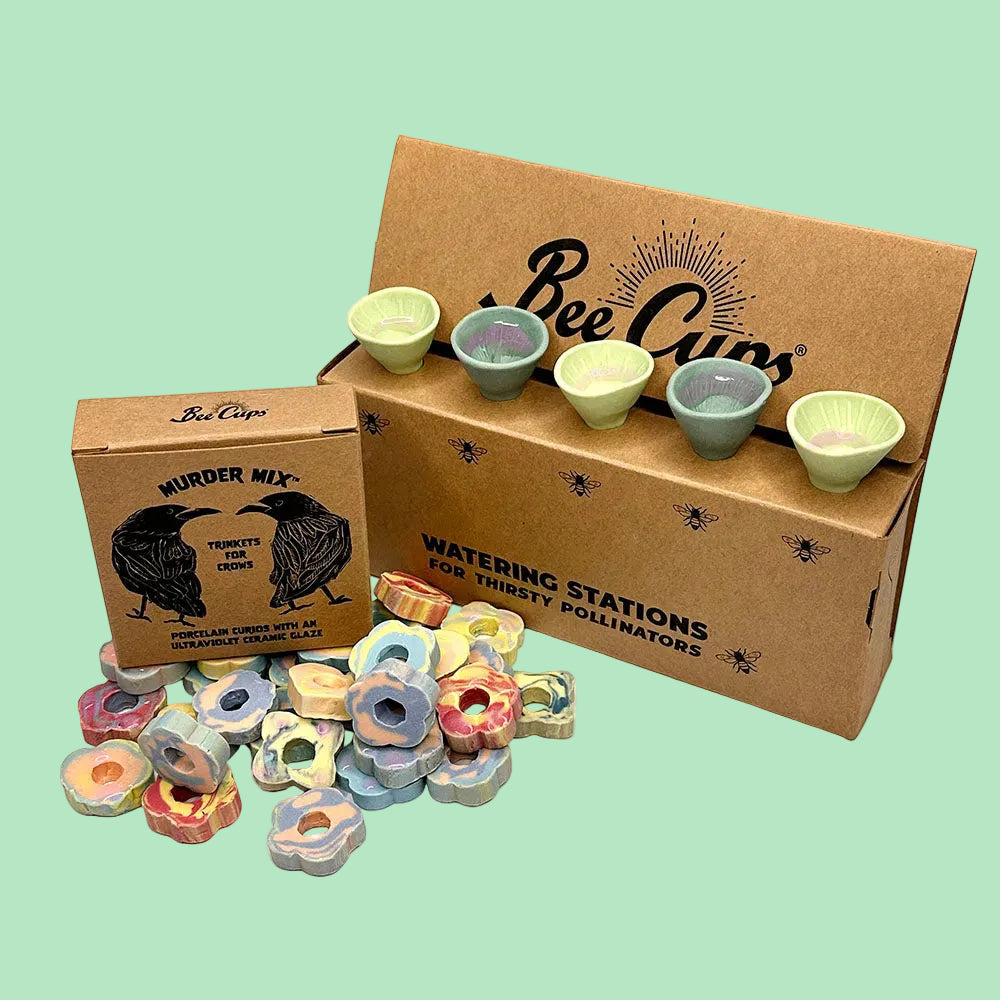 Welcome a little luck into your garden with Crow and Clover, a March-inspired bundle celebrating St. Patrick’s Day through color, craft, and clever wildlife. This seasonal set features a 5-pack of Bee Cups® in alternating shades of light and dark green with crisp white centers, paired with our signature Murder Mix—UV-glazed trinkets designed to captivate curious crows.
