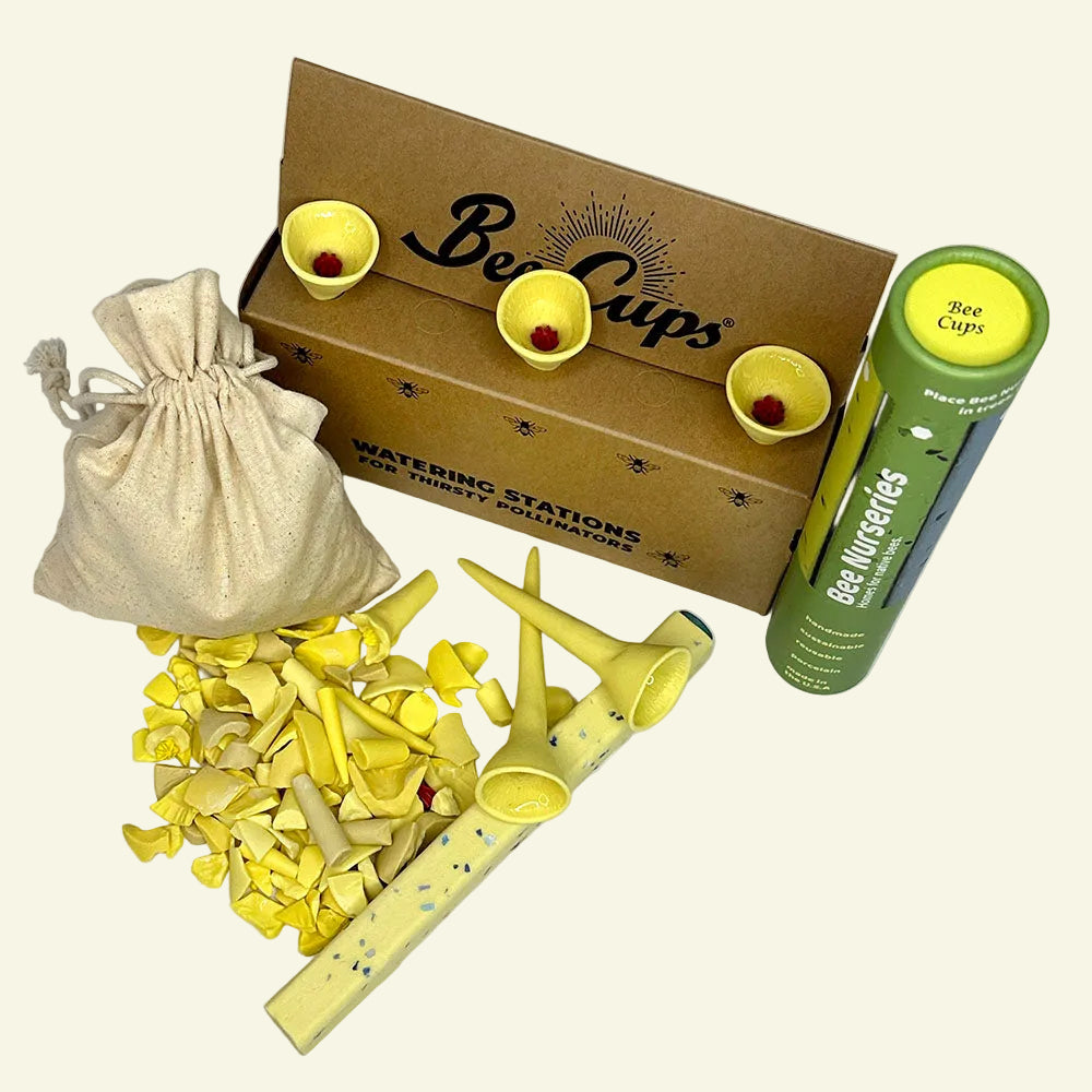 3-pack Bees Knees Bee Cups® watering stations. Yellow cups with red centers and our ultraviolet-reactive glaze