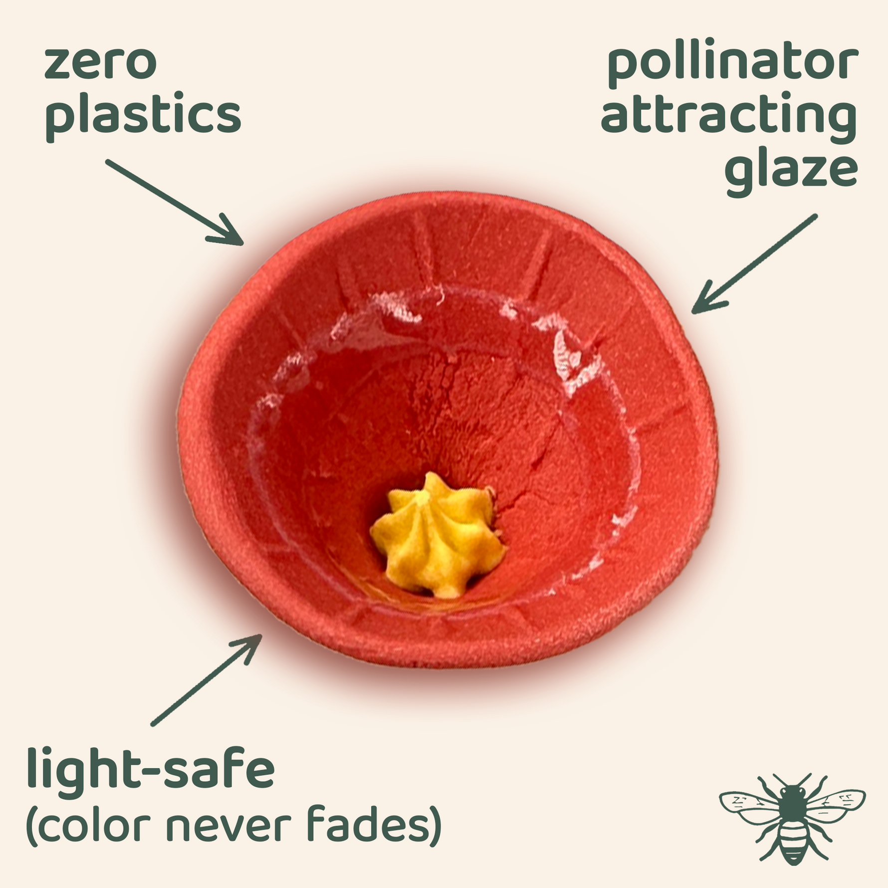 Red Bee Cups watering stations with yellow centers and Bee Vision Glaze.