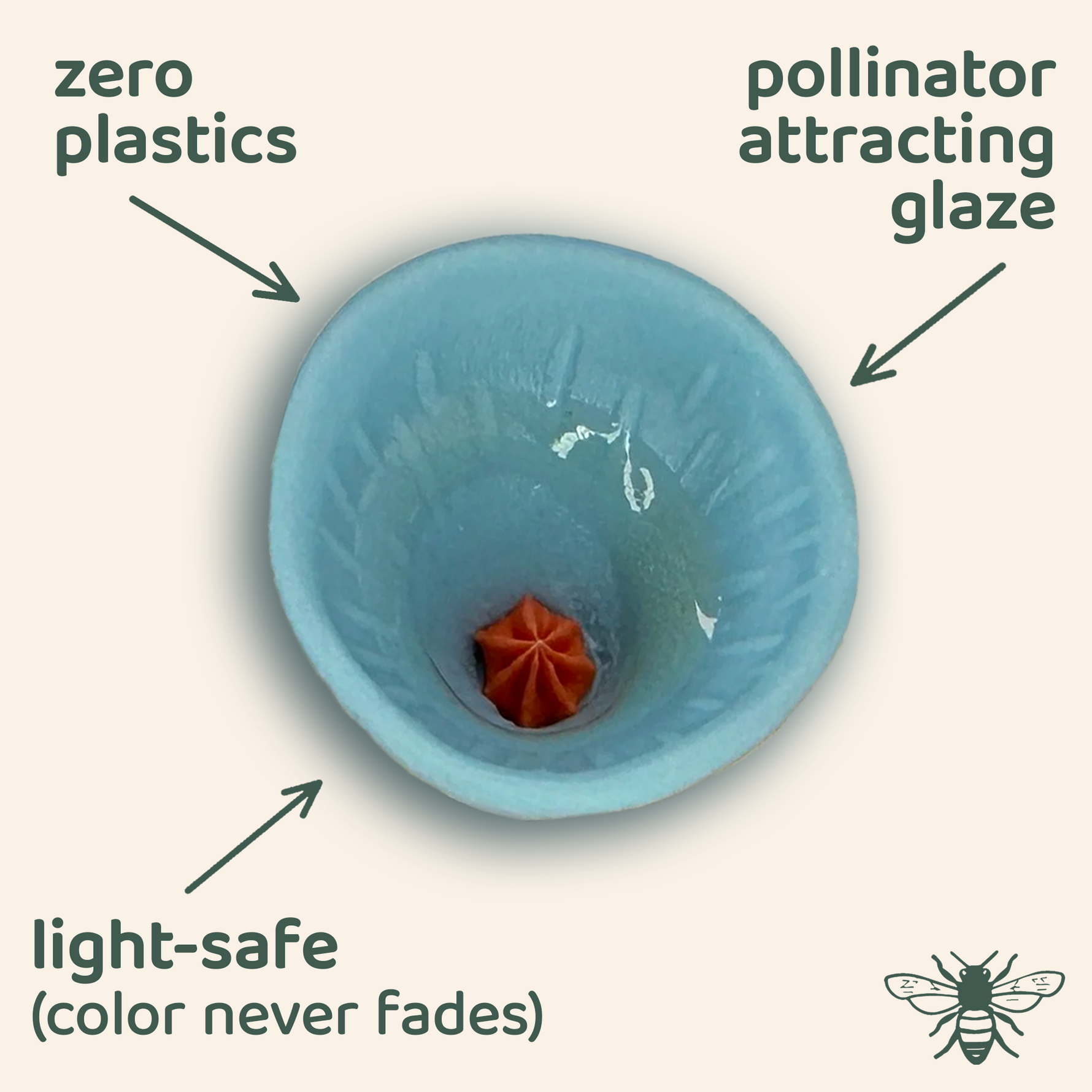 Every Bee Cups® watering station collects a teaspoon of water for thirsty pollinators. They are heated to over 2200 degrees Fahrenheit in a kiln. Bee Cups are 100% light-safe and will never fade. Bee Cups® will not leach chemicals into the soil or water and contain ZERO plastics.
