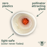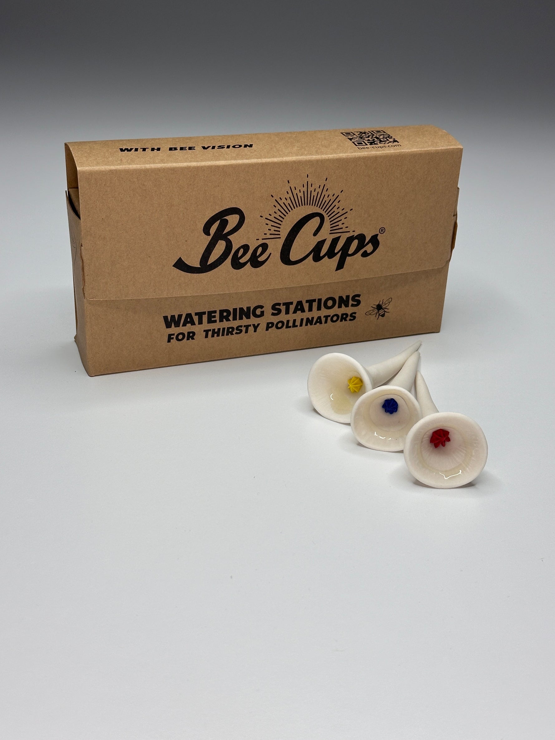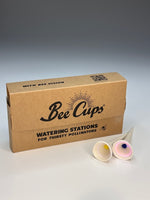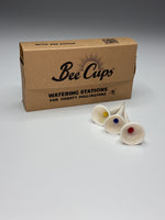 White Bee Cups watering stations with brightly colored centers and Bee Vision Glaze.